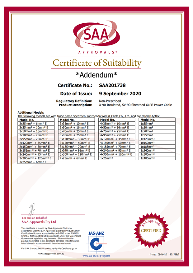 深圳建圳達(dá)電線電纜有限公司,成立于2000年,是一家電線電纜制造商,我們通過了世界各地不同市場(chǎng)的多數(shù)認(rèn)證,如:CCC、RoHS、CB、SAA、TUV、VDE、PSE、BPS、UL、CSA。我們根據(jù)定制產(chǎn)品不斷更新新的認(rèn)證。經(jīng)過數(shù)十年的發(fā)展,我們與來自世界各地的客戶建立了長(zhǎng)期的合作關(guān)系。我們?cè)?jīng)是菲律賓機(jī)場(chǎng),,柬埔寨的電力站,美國(guó)的醫(yī)院,工廠,埃塞俄比亞的水電站項(xiàng)目。我們是一家值得信賴的電線供應(yīng)商。